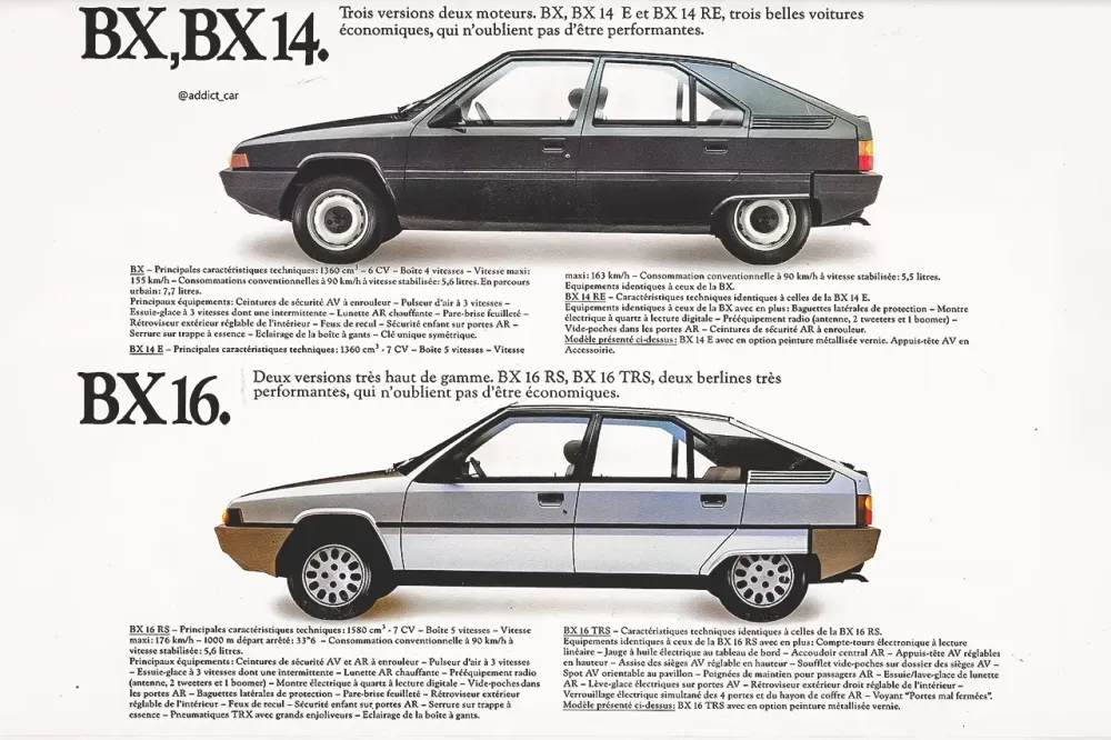 Não é preciso estar praticamente senil para desejar um BX. Na verdade, este carro era uma evolução bastante adequada do GS. Mantinha os predicados ao nível do conforto e performance e sacrificava um pouco a qualidade dos materiais e montagem a favor de um design mais contemporâneo e até atraente, por comparação com os concorrentes de 1982. A autoria das linhas era de Marcello Gandini. O desenho já era conhecido de dois “concept cars” que a Bertone havia realizado para a Reliant e para a Volvo. Mecanicamente, era um automóvel mais convencional do que o antecessor, já que abandonava os motores boxer a favor de bons motores de arquitectura convencional montados transversalmente, todos eles bastante elásticos e eficazes. Os custos de manutenção baixaram em resultado dessa opção. O BX 16 era um carro rápido para o segmento e apesar da suspensão hidropneumática privilegiar o conforto, o comportamento era saudável, sem convidar a excessos.