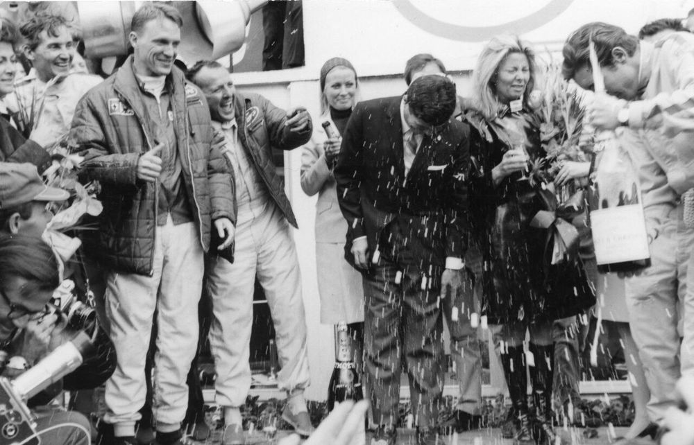 Curiosamente, o que realmente inspirou aquele momento não foi qualquer acto de rebeldia, mas antes um verdadeiro acidente ocorrido no ano anterior. Na edição de 1966, os vencedores da classe até 2 litros (quartos da geral) foi Jo Siffert e Colin Davies em Porsche 906/6 LH. No momento em que foram receber o troféu e celebrar a vitória, Jo Siffert não conseguiu evitar que a rolha da garrafa saltasse e molhasse todos quantos estavam por perto.