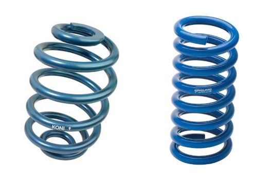 Na figura, a mola à esquerda é designada de mola helicoidal do tipo Barril (Mini-block). Estas molas apresentam a curva de rigidez progressiva (não-linear) e diferencia-se da mola helicoidal standard (à direita na figura) devido à sua forma de “barril”. Esta forma provoca uma menor altura de bloqueio da mola, ou seja, altura em que todos elos de uma mola helicoidal se tocam.