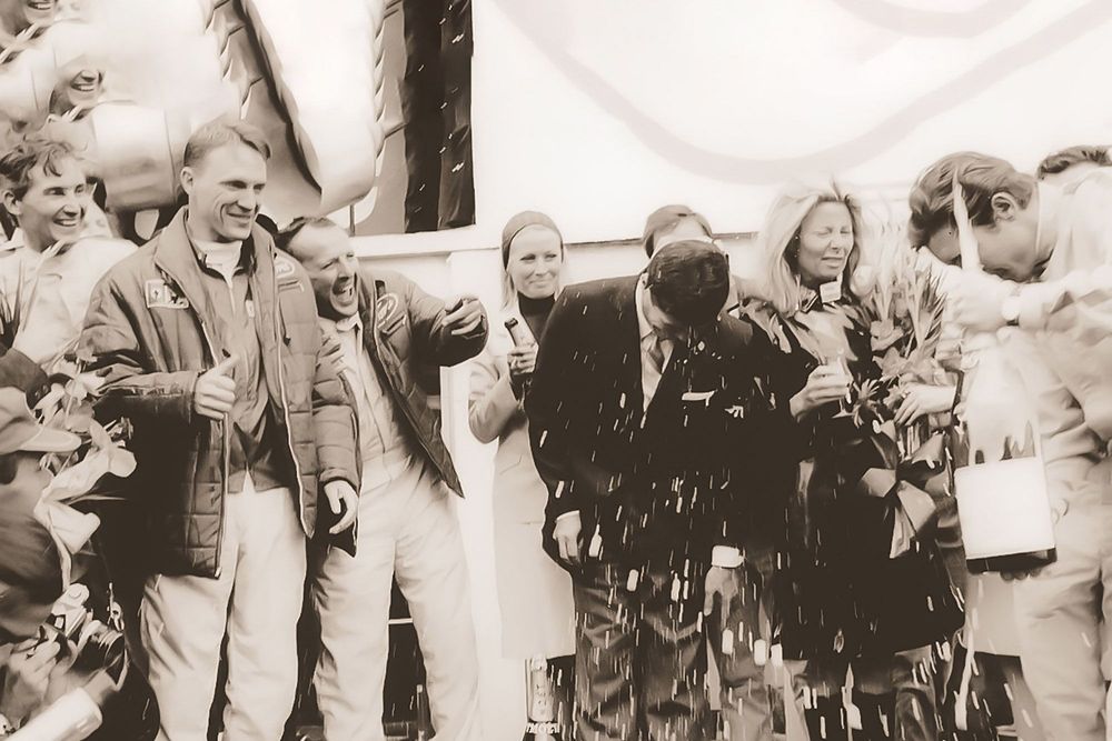 Curiosamente, o que realmente inspirou aquele momento não foi qualquer acto de rebeldia, mas antes um verdadeiro acidente ocorrido no ano anterior. Na edição de 1966, os vencedores da classe até 2 litros (quartos da geral) foi Jo Siffert e Colin Davies em Porsche 906/6 LH. No momento em que foram receber o troféu e celebrar a vitória, Jo Siffert não conseguiu evitar que a rolha da garrafa saltasse e molhasse todos quantos estavam por perto.